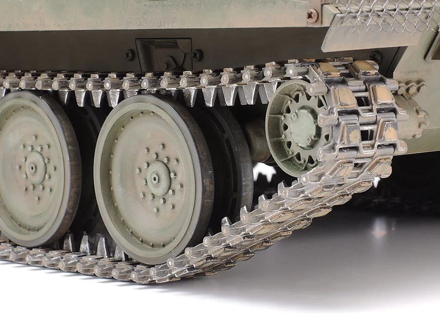• Features a precision aluminum gun barrel, plus other metal components including lower hull, drive sprockets, coil-sprung suspension arms and more.