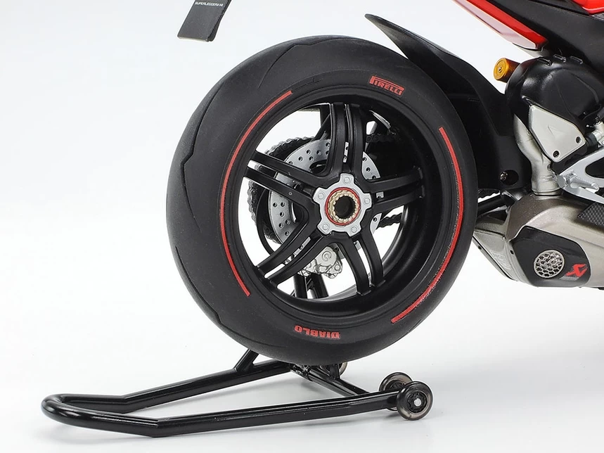 This 1/12 scale model assembly kit recreates the Superleggera V4 of which only 500 of the full-size motorcycle were produced. The Superleggera V4 is a road-legal version of the Panigale V4 produced by the legendary Italian motorcycle manufacturer, Ducati. This motorcycle’s cornerstone is in the lightening, facilitated by carbon fiber material in the fairings, chassis and swing arm, and its eye-catching design features the distinctive carbon fiber biplane wings on either side of the front cowl, for aerodynamics. The engine is the Desmosedici Stradale R, a 998cc V4 powerplant with Ducati’s Desmodromic valve timing system. The full-size motorcycle also uses Öhlins suspension and Brembo brake system. In addition, installation of the Akrapovič titanium muffler– which is for the racing kit – with a dedicated engine part results in a superb power/weight ratio of 1.54hp/ kg.