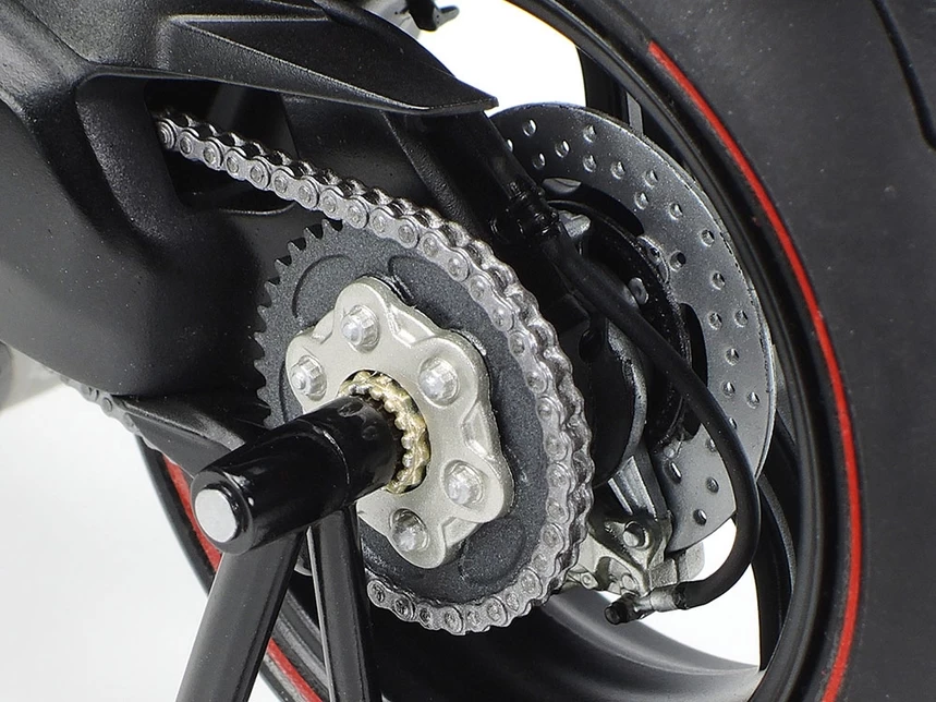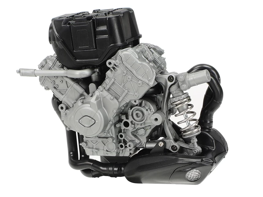 • The V4 engine, swing arm, front fork, side cowlings and fuel tank are attached to frame by screws. Side cowlings and fuel tank are removable even after assembly.