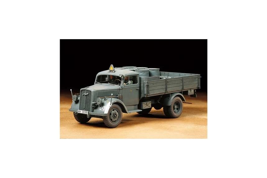 This is a 1/35 plastic assembly model of German 3ton 4×2 Cargo Truck. ★Length:174mm Sturdy body and unique cabin are all realistically reproduced. ★Accurately recreated forward-bent chassis, and suspension features fewer parts for easy assembly. ★Movable front wheels for perfect diorama situations. ★The rear cargo area has a realistic wood pattern for greater realism. ★Masking stickers for windows are included in kit. ★1 driver and 1 navigator figure and four different markings included. ★Comes with sets of fuel drums and jerry cans.