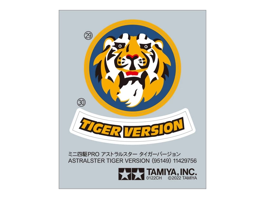 This mini 4WD racing assembly kit depicts the Astral Star Tiger. The Astral Star Tiger is a special version of the Astral Star, a machine with a real-life feel, designed by Kota Nezu of znug design. A sticker designed with a tiger’s face that gives off a glare with the front hood adds an extraordinary impact to the stylish appearance of this special limited-release. The body is mounted on the easy-to-assemble MA chassis for balanced racing on Mini 4WD tracks.