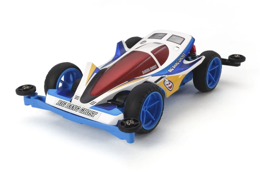 This is a premium release of the Big Bang Ghost, a sleek machine that is featured in a Japanese cartoon spin-off of the major Mini 4WD comic “Kaze no Racer Otokogi”. Big Bang Ghost, which was driven by Baron Ghost, features an aerodynamic body with unique V-shaped front and mid wings. This Mini 4WD model runs on the adaptable and speedy Super-II chassis.