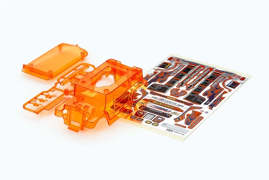 This is a special limited edition body parts set, based on the Dyipne (FM-A) Mini 4WD kit. (Item 18717) The set is composed of a Clear Orange ABS plastic body, and dedicated stickers (a color variation of the stickers included in Item 92419 Dyipne Silver Metallic).