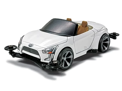 This is a Mini 4WD racer assembly kit of the Daihatsu Kopen Future Included RMZ. The Daihatsu Kopen Future Included RMZ is a concept car that was unveiled to the public at the Tokyo Motor Show from November 20-December 1, 2013. The body panels on the full-size high-tech concept car are interchangeable, allowing owners to change them around and make the body of their choice.