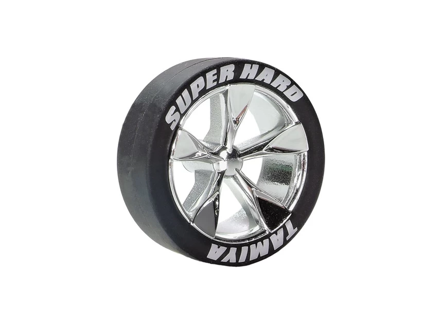 • Plated 5-spoke wheels are paired with super hard low-profile tires featuring white sidewall lettering: TAMIYA SUPER HARD.