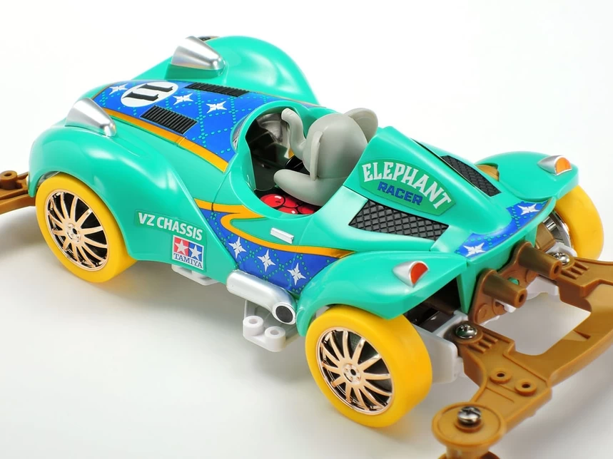 Meet the Elephant Racer! This Mini 4WD kit combines the adorable driver with the classic car body first used in the Panda Racer 2 model (Item 18092). The body and driver sit on top the cutting edge VZ chassis.
