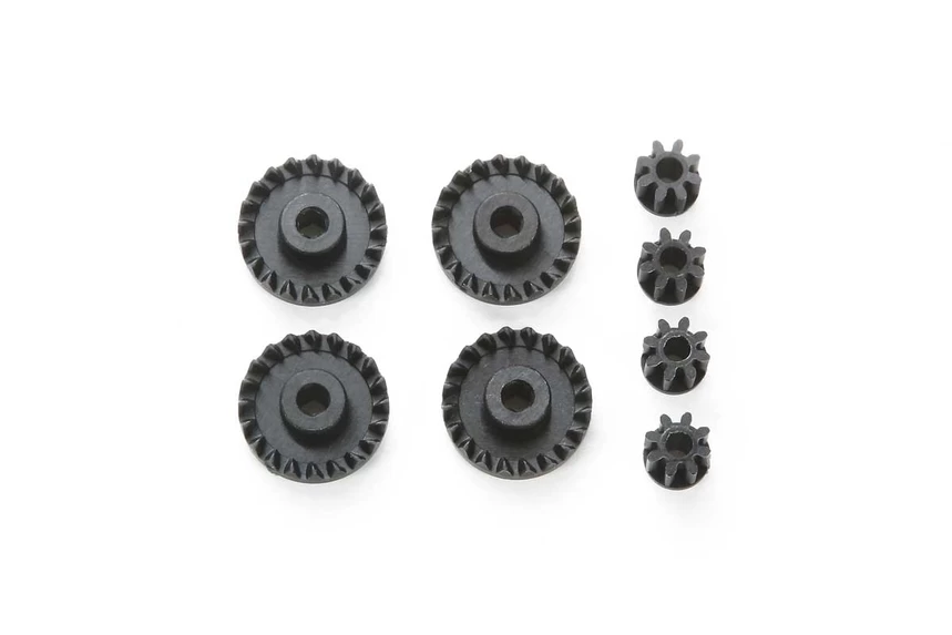 These are carbon reinforced gears found in Tamiya’s Mini 4WD racing machines. They replace the standard plastic gears that are labeled G13 along with the 8-tooth pinion gear. These reinforced carbon gears are ideal to use when using high output motors.
