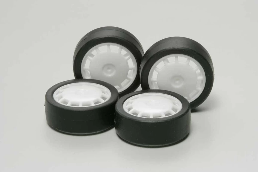 Offering low profile tire & wheel sets designed for use with normal Mini 4WD and Mini 4WD PRO. Use of low-height wheels improves overall rotation efficiency. Lightweight elastomer tires offer improved stability and road holding. Fashionable gold-colored fin type wheels are perfect for use with sportscar type Mini 4WD racers. Simple dish type design also available.