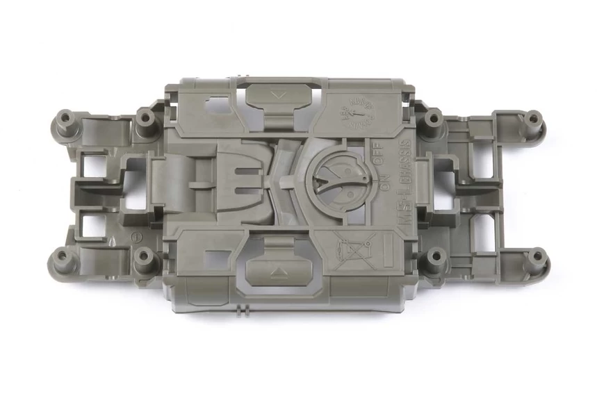 This Mini 4WD PRO Center Chassis is now made using the much stronger ABS resin. Compared to the MS Chassis. It is 10% lighter and has an improved air cooling design. The chassis uses a new turn switch system for the switch lever. It is recommended to combine this lightweight chassis with the separately-available reinforced gear cover for the MS Chassis (Item No.15363)