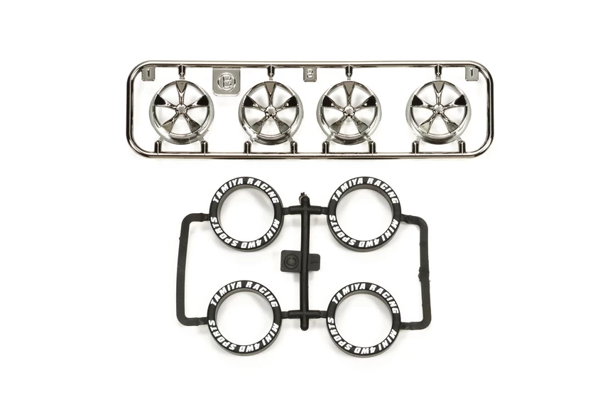 This 5-spoke wheel set can be used on many of Tamiya’s Mini 4WD machines. The included tires are low profile with white lettering on the sidewall and the wheels are black plated chrome.