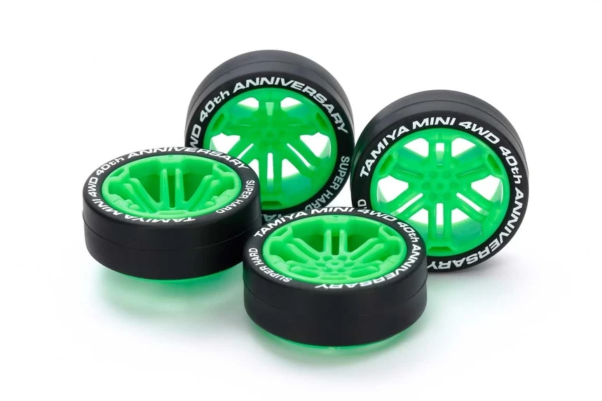 This is a limited-edition product to commemorate Mini 4WD 40th Anniversary. This stylish set includes popular 12-spoke wheels and super hard low-profile tires which feature lower grip for speedy and smooth cornering, and reduce bouncing after jumping. Use this set to give your Mini 4WD race car a stylish image!