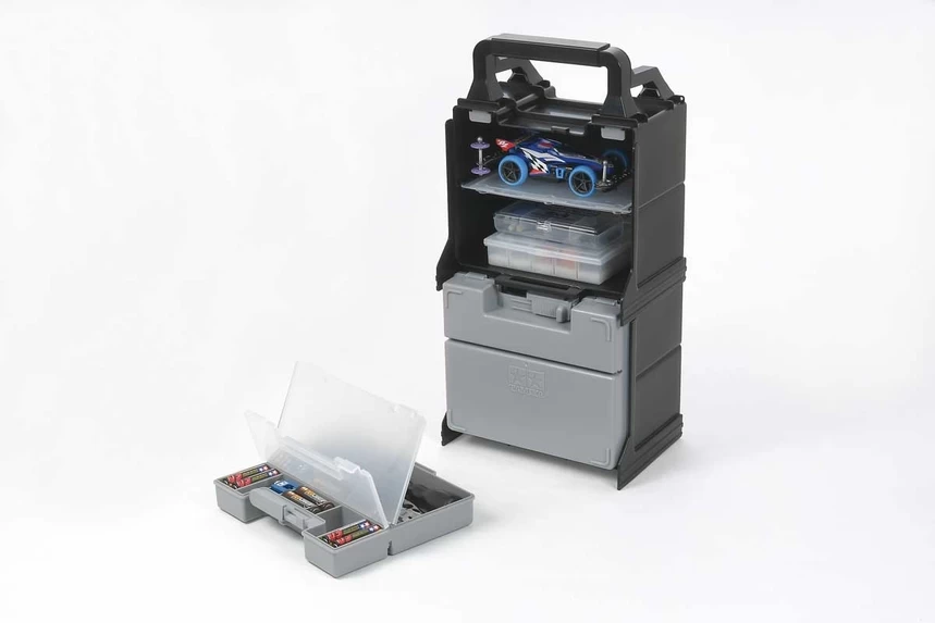 This carrying case is designed specifically with Mini 4WD users in mind and can be used to hold everything including tools, batteries, parts, and the machines themselves. It is a convenient item for keeping all your Mini 4WD items in one place.