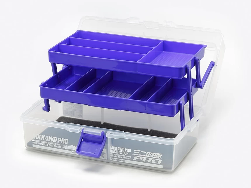 This box was designed especially for the Mini 4WD racer! The various internal sections expand once the box is opened, allowing quick access to your parts. Dividers can be moved depending upon the size of the parts you carry. The bottom section can hold up to three fully hopped-up Mini 4WD cars. Dimensions: 310mm x 214mm x 132mm