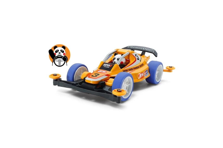 This is a Mini 4WD model assembly kit featuring an adorable panda bear driver figure, plus a newly-designed body inspired by single-seater buggies. The open cockpit lets you watch the panda as your machine whizzes around the track! The kit features orange body parts, and stickers for decoration, while the panda figure comes pre-painted and assembled.