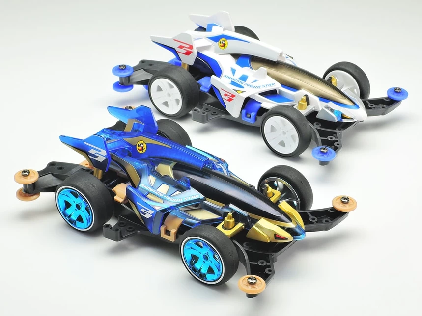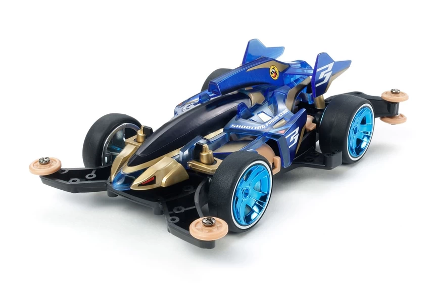 This is the first special edition of the Tamiya Shooting Proud Star (Item 18641). It is a car which graced the Japanese Mini 4WD comic “Hyper Dash! Yonkuro” in CoroCoro Aniki and was inspired by the Dash-3 Shooting Star. The model is based upon the midship motor, aerodynamically honed MA chassis.