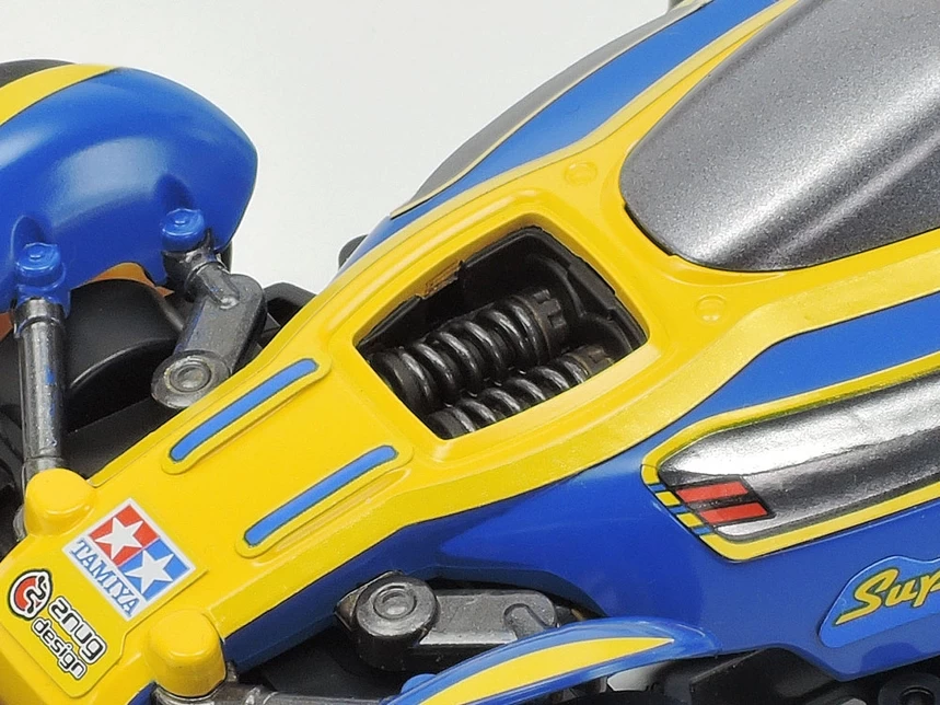 This Mini 4WD race kit depicts the Super Avante Jr. which is paired with the VZ chassis and has a body designed by Japanese designer Kota Nezu of znug design, who designed our recently-released R/C Super Avante body (Item 58696). This Mini 4WD model renders the Super Avante’s streamlined design in smaller scale with distinctive, small-type front fenders!