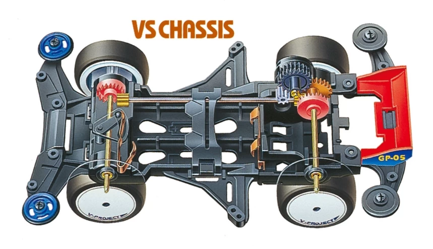 The VS chassis is a lightweight chassis featuring a short wheelbase. It features the main chassis, rear roller-stay, rollers, gear cover and other parts molded in black. Comes with 5:1 speed gear.