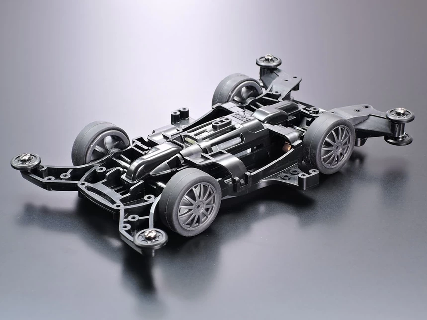 The MA (Midship AERO) Chassis has its motor in the center, and features a design which focuses upon achieving outstanding aerodynamic performance. It has six individual low-friction rollers, a rear skid bar and other speedy features developed thanks to years of design experience. The single-piece monocoque frame also guarantees that assembling and keeping the car well-maintained is a task that can be performed by beginners and veteran racers alike. Here, the MA chassis features a 3.5:1 gear ratio.