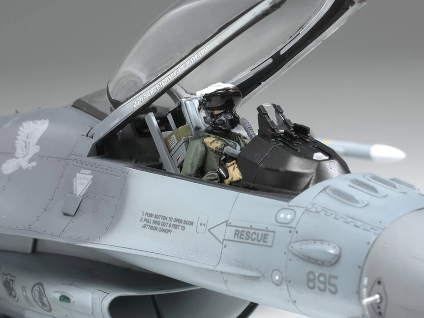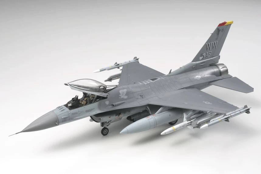 ★1/48 scale assembly kit display model of the F-16CJ Block 50. ★Length: 316mm, Width: 197mm ★IFF antenna array in front of the cockpit distinguishes this CCIP-equipped model from other F-16s. ★Curved form of the F-16 accurately reproduced with trademark Tamiya precision. ★Moveable horizontal stabilizers. “Flaperons” can be modelled in the up or down positions. ★Full ordnance load including AGM-88 HARM, AIM-120C AMRAAM, AIM-9M/X Sidewinder, ECM pod, and fuel tanks included. ★Centerline and inner wing pylons as well as tail assembly feature polycaps to allow easy detachment for storage. ★1 pilot figure included with 2 types of flight helmet. ★3 types of markings included. ★Parts also included to depict a pre-upgrade F-16CJ.