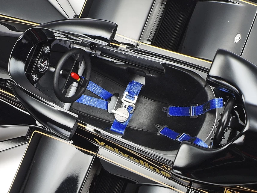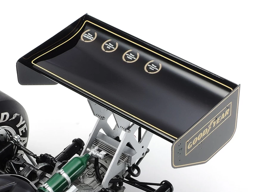 This model kit recreates the famous Lotus Type 78, which was driven by Mario Andretti and Gunnar Nilsson. The Lotus Type 78 made its name in history as the first full-fledged wing car in Formula One. The race car has a slender body based on a sharp wedge shape, and the inside of the side pontoon has a wing shape that is upside down with inverted aircraft- like wings to achieve a greater down force effect without increasing air resistance.