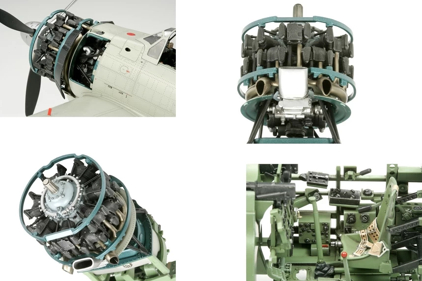 Tamiya has accurately reproduced the Mitsubishi Zero Model 21’s graceful form, complete with long slender wings and tight engine cowling. The famous Nakajima Sakae 12 radial engine is fully detailed, with all the features that distinguish it from the engines mounted on the later Model 52. Engine mount, oil tank, main fuel tank, and other internal details can also be made visible. The model kit also includes a complete scale recreation of the cockpit, with the Type 96 Model 1 radio system and other features unique to the Model 21.