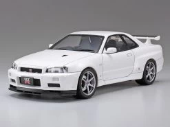 Hi-spec race/road car fans had something to cheer about in October 2000, with the release of the Skyline GT-R V Spec II. This precision plastic model assembly kit beautifully recreates the car, which featured minor updates to its predecessors, the most dramatic of which were perhaps the bonnet with NACA ducts, and the enlarged rear wing. V Spec II brake discs are also accurately captured. The underside of the model also has plenty to catch the eye, with a realistic depiction of the multi-link suspension and 4WD system, while the diffuser is rendered using clear parts. The kit also includes parts depicting tuning options such as Nismo wheels, a GT wing stay and drilled brake discs. Decals are included to depict the limited edition “Nür” release of this thoroughbred vehicle.