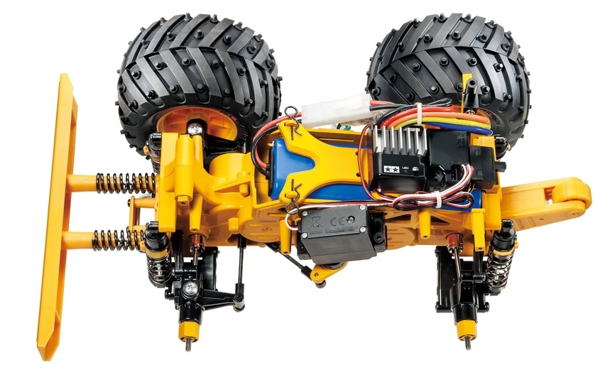 This gear-driven 4WD chassis is based around a lightweight and tough monocoque frame, with power provided by the centrally-positioned motor. It utilizes a ‘square’ setup with similar tread and wheelbase lengths. Sealed gearbox is integrated into the frame and protects from dust and debris, while the built-in front and rear differential gears provide smooth cornering. This is reinforced by 4-wheel double wishbone suspension and friction dampers plus a 2-piece tie rod steering setup with the servo on the left for excellent response. Furthermore, it has wheels molded in yellow to match the chassis, fitted with big 115mm diameter tires, in addition to a rear support bar with roller to prevent the model from flipping.