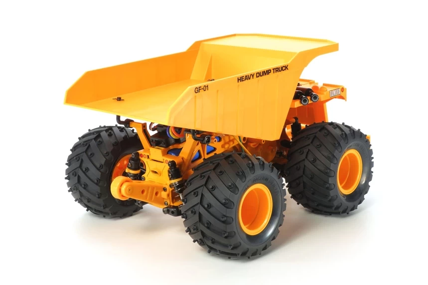 Dump trucks earn their living in some of the toughest workplaces around: large-scale construction sites, mines and quarries to name but a few. The largest of them are known as “off-highway trucks” which cannot be driven on public roads; factory built, they are disassembled and component parts such as the chassis, cab, fenders, axles and rear bed are transported via trailer to their employer, where they are re-assembled on site. These giant vehicles can reach the height of 2-storey buildings, with tires exceeding 4 meters in diameter, engines generating over 3,500hp, and an ability to carry loads topping 300 tons. Some can even be controlled remotely for use in dangerous environments. Now, you can feel the power scaled down into realistic 1/24, with the addition of this exciting new R/C model assembly kit, with realistic yellow ABS resin molded cab and rear bed parts. The model runs on the gear-driven 4WD of the GF-01 chassis.