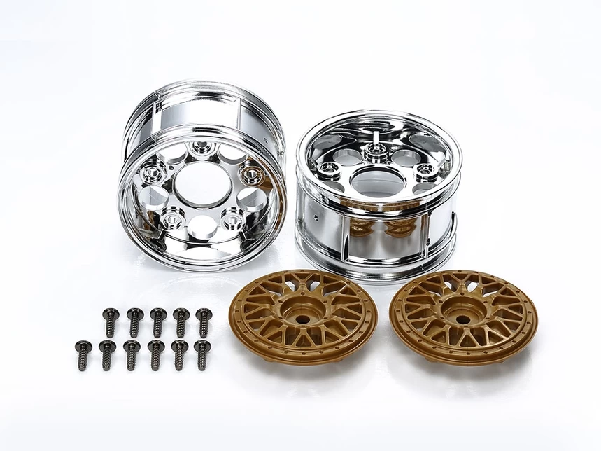 This is a two-piece mesh wheel set. The wheel rim itself is chrome plated while the mesh centerpiece is molded in gold.