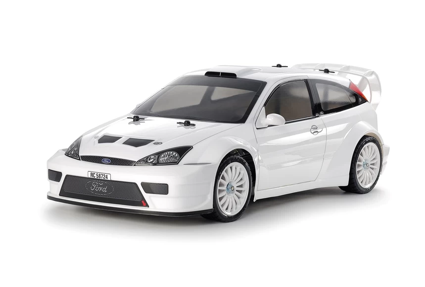 This R/C model assembly kit recreates the rally oriented 2003 Ford Focus RS Custom on the easy to assemble and drive TT-02 chassis. In 2003, the Ford Motor Co. Team chief engineer Christian Loriaux made various changes to the Focus such as seat position, roll cage and suspension, and improved aerodynamics with the updated bumper shape, hood intake position and large rear wing and more. The 2-liter inline-4 turbo engine was capable of 300PS and 550Nm. This rally car secured second place in the Manufacturer ranking four times during its 7-year race campaign and showed off its strength. This kit recreates a custom street version without sponsor logos.