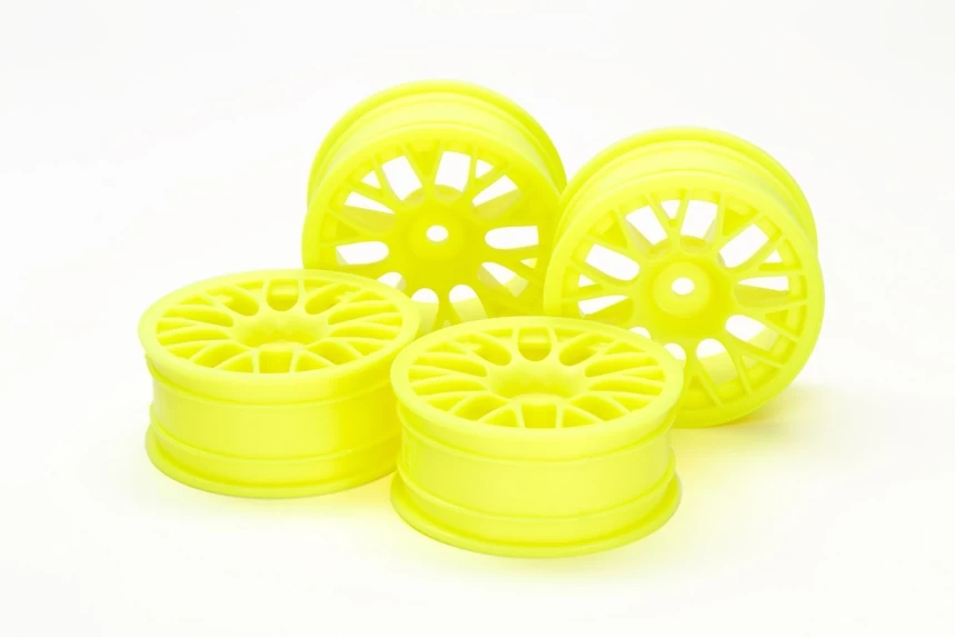 This is a color variation of Tamiya’s classic mesh wheel set for touring and sports car R/C kit models. The original set of wheels come in white, whereas these come in a vibrant shade of yellow.
