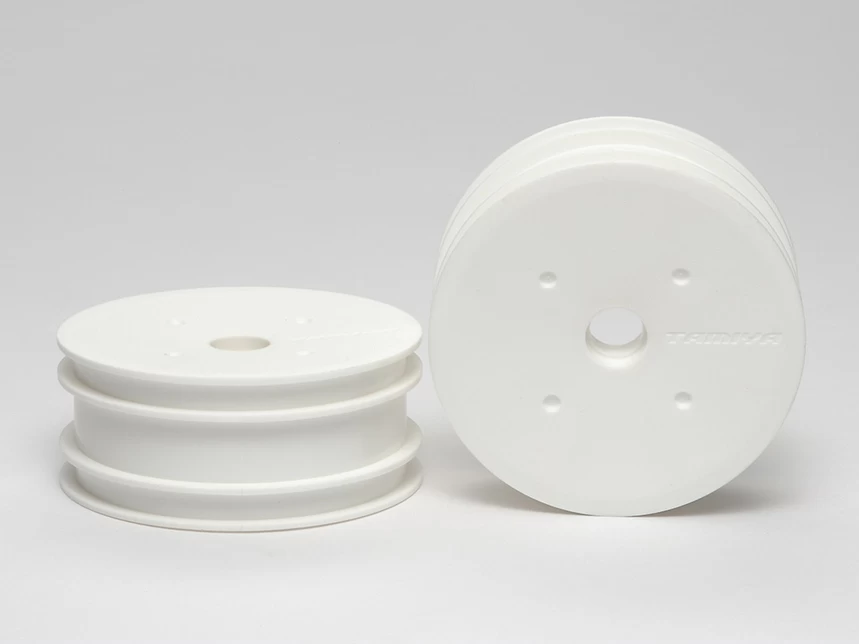 These white dish-type wheels are made from tough ABS resin. They perform excellently on high-grip surfaces such as carpet and asphalt. Their greater rigidity also improves durability at the point of attachment to wheel hub and pin. Note: while the design is largely the same as existing nylon wheels Items 51414, 51320 and 51321, the dimensions differ slightly.