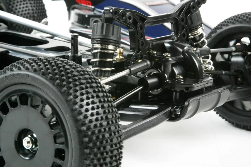 Durable monocoque bathtub frame sees the heavy battery and R/C mechanism components mounted low and central for the best vehicle balance. Even the oil dampers are located within the wheelbase for greater stability and cornering performance. Compact gearboxes are equipped with ball differentials, and the propeller shaft directly links to the front bevel gear to decrease power loss during transmission. 4-wheel double wishbone suspension with long suspension arms provides excellent shock absorption, and a variety of attachment positions gives the driver many options when tuning.