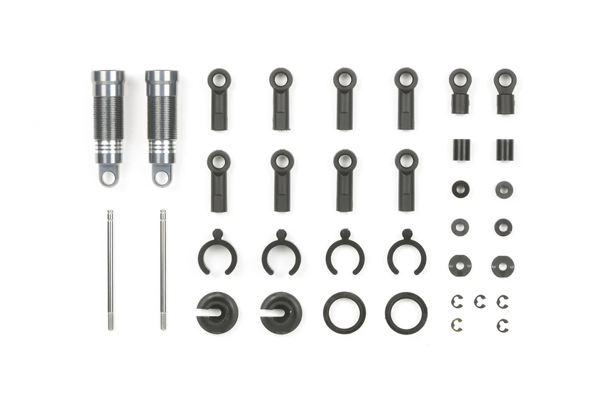 Designed for use with ITEM 40513 GB-01 Aeration Oil Dampers, this set contains aeration damper short case x2, 34mm damper shaft x2, TamTech-Gear V Parts x2, and 1.5mm E-ring x5 to provide suspension setting variations.