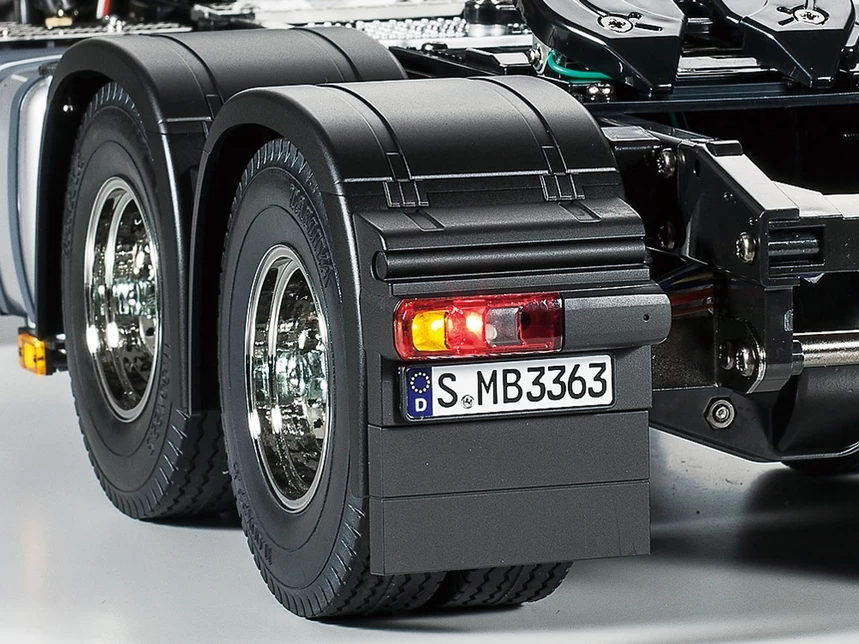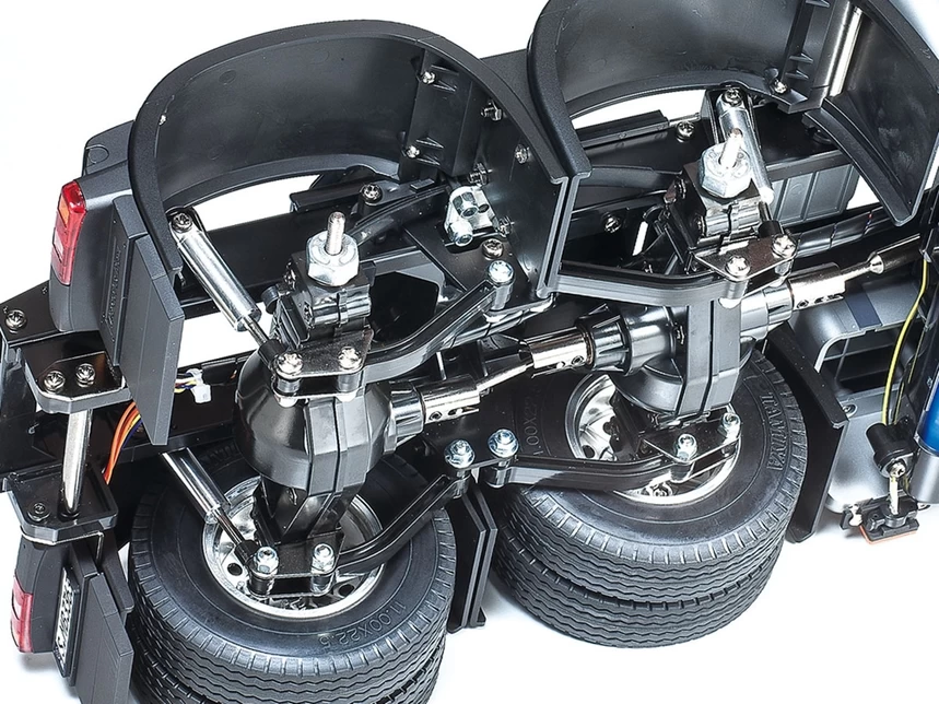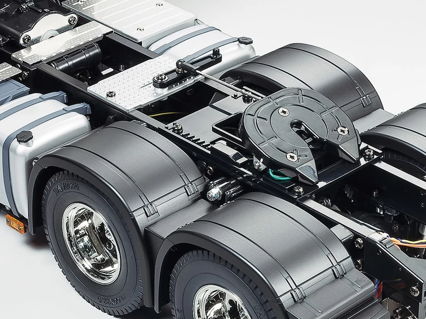The Tamiya rendition faithfully captures the truck’s modern form with the use of ABS plastic body parts and a number of metal chassis components. One look at the detailed interior and auxiliary equipment, such as air tanks, will confirm that the body features replica-quality realism, which is further enhanced with metal transfers depicting emblems and numerous metal-plated parts. The chassis is built for durability as it uses aluminum side channels with resin cross members. Drivability is accomplished by power from the front-mounted motor and is transmitted via a propeller shaft to the rear axle; built-in differential gears guarantee smooth cornering. Gear changes can be made via a separately-sold Tamiya 4-channel transmitter.