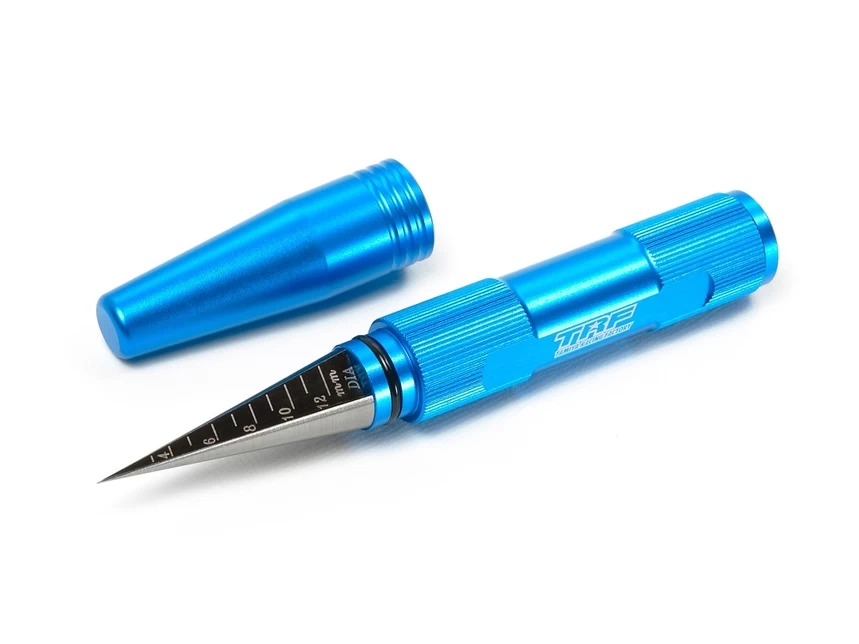 Reamers are incredibly handy when making holes in polycarbonate bodies. This tool features a precision tool steel point that can make holes from 3mm to 13mm in diameter. Features an aluminum grip with blue anodized finish and laser engraved TRF logo. An aluminum cap covers the tool when not in use to help prevent injury.