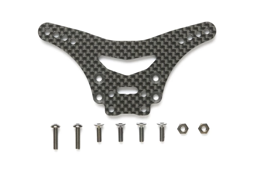 This durable 3.5mm thick carbon damper stay replaces the kit-standard plastic part to increase attachment rigidity for optimum damper effect. It also has damper attachment holes that are higher than the kit-standard positions to enable a wider ground clearance adjustment.
