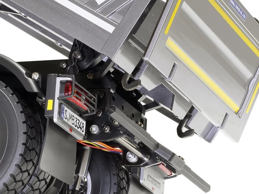 This actuator set is designed to complement the Mercedes-Benz Arocs 3348 Dump Truck. When using a 4-channel transmitter, the dump feature of the trucks bed can be fully controlled.