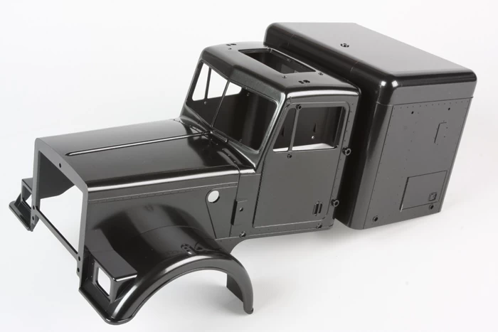 This R/C model assembly kit features a precision-molded tractor truck body with pre-painted metallic black parts offset by chrome-plated parts such as the front grille, air cleaners and more. The tough ladder frame chassis is paired with front and rear metal leaf spring dampers for excellent performance and durability. The front-mounted motor provides power to the rear wheels via propeller shaft, mirroring the system used on actual road-going trucks, and utilizes a 3-speed transmission with manually-controllable gear changes.