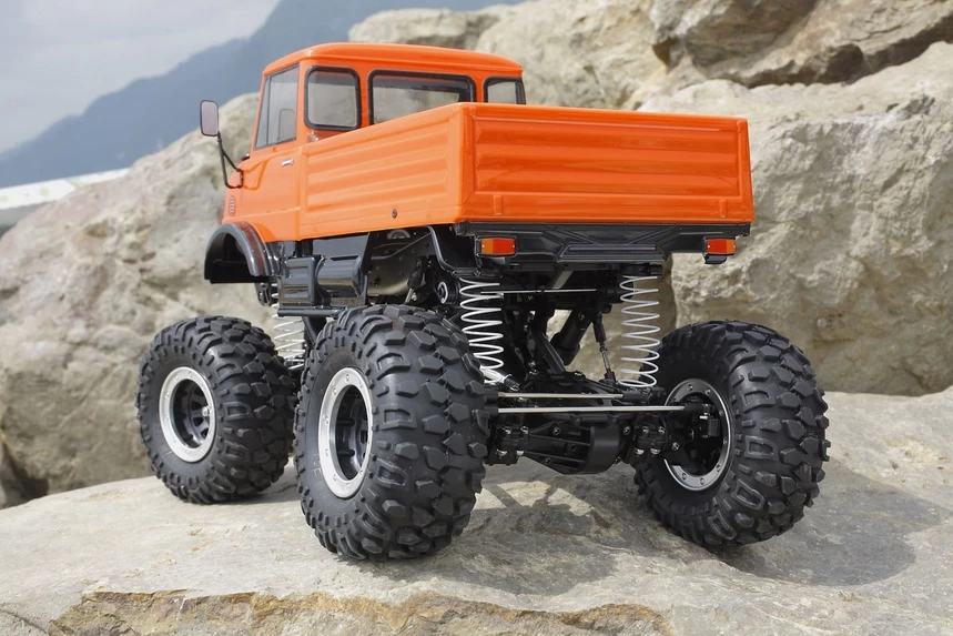 This is a 1/10 scale R/C assembly Rock Crawler machine of the Mercedes-Benz Unimog which has been a long-seller truck among its series since its debut in 1963. The humorous form of its curved hood with round headlights is realistically reproduced by a durable polycarbonate body shell. The Rock Crawling CR-01 chassis features superior off-road performance and is equipped with a durable ladder frame, aluminum side channels and resin cross members, 4-link suspension with aluminum rods and oil dampers, and a shaft driven 4WD with lockable differentials. Also comes with realistic rubber tires with side wall tread patterns and the beadlock wheels. This machine will surely bring you a great enjoyment in conquering difficult rocky terrain.
