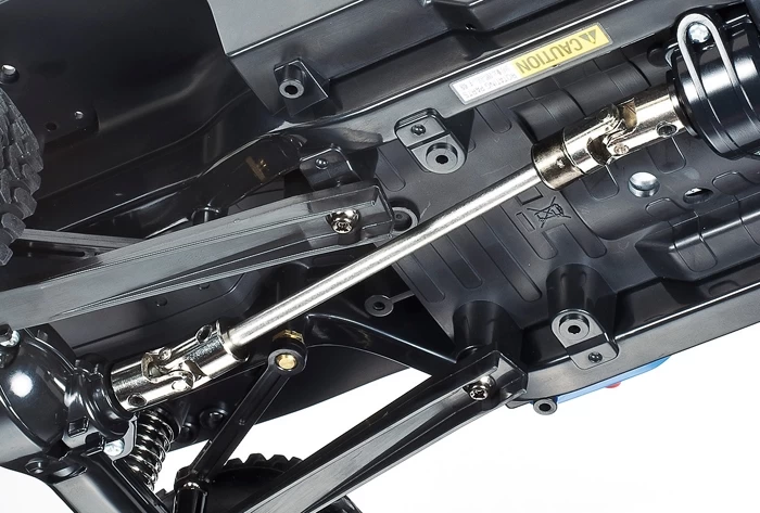 The CC-01’s highly reliable and efficient full-time 4WD system features a longitudinally-positioned motor, which transmits power to the front wheels via the gearbox and to the rear wheels via propeller shaft. Front and rear differentials enable smooth cornering, and for even greater off-road performance on rough terrain, the rear differential may be locked during assembly. The chassis suspension employs double-wishbone front upper single links and lower H-shaped arms plus rear rigid suspension. With 4 CVA oil dampers in total fitted to the front and rear, there’s enough cushion to take on even the roughest surfaces. It also looks the part, with cool black dish-type wheels, plus 94mm-diameter block tread pattern tires.