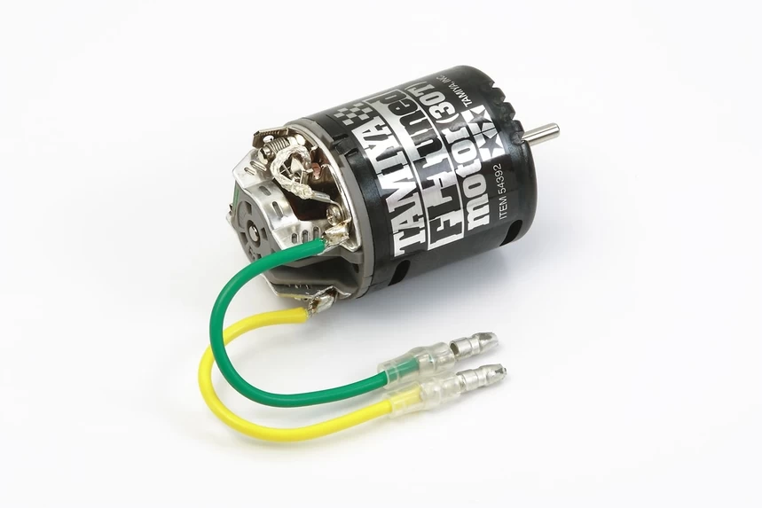 This basic tuned motor features the can in black and a silver color end bell. Condenser chip minimizes noise. Input voltage: 6.6-7.2V Torque at recommended load: 15,200rpm (7.2V) Maximum torque: 44.1mNm