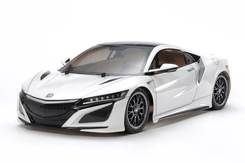 This is a R/C model assembly kit recreating the form of the outstanding new NSX super sports car. The included polycarbonate body is lightweight and durable, and captures the aerodynamically-styled NSX silhouette with aplomb. Stickers are included to recreate markings on the car, including the distinctive “Jewel Eye” 6-lamp headlights, window frames and air intake mesh. The model runs on the adaptable TT-02 chassis, a beginner friendly unit with tuning potential!