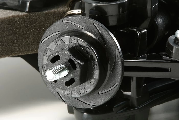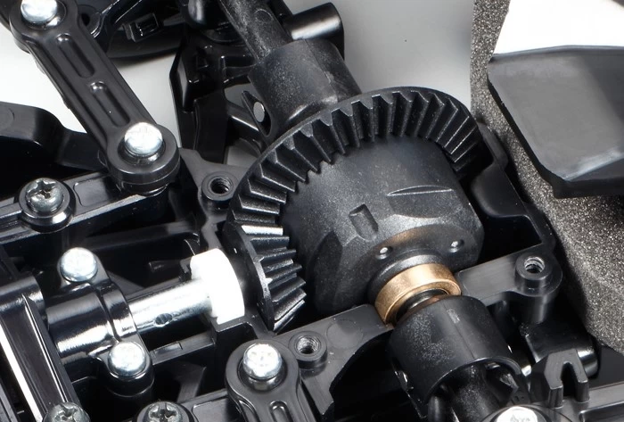 The shaft-driven 4WD TT-02 chassis employs a longitudinal layout with the battery on the left and the motor on the right, to give excellent stability. In addition, it features identical left and right suspension arms and uprights for ease of assembly, plus easy-to-maintain gearboxes. It is a highly adaptable chassis, as it offers 2 different wheelbases, 2 ground clearance settings and 2 tread set-ups in addition to a range of 10 possible gear ratios. It is not short on looks either, with brake disc-shaped wheel hubs and stylish front bumper supports. Gun metal color 12-spoke wheels are paired with slick tires for a racy finish.