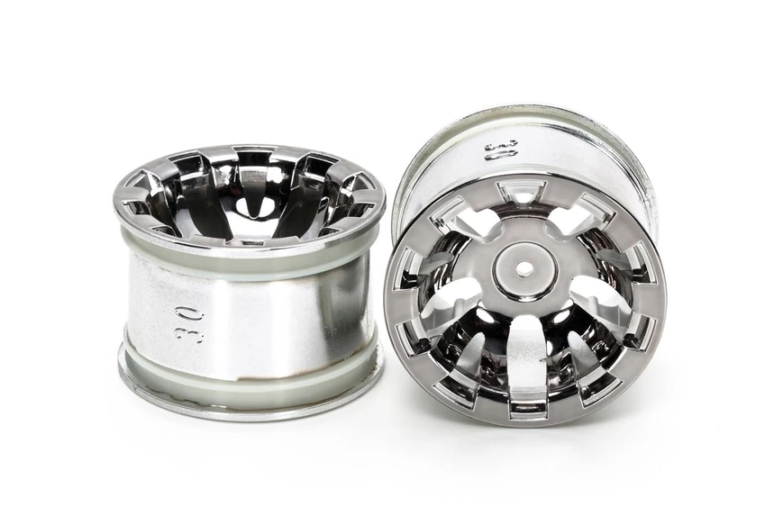These are plastic chrome plated rear wheels designed for the T3-01 Dancing Rider Trike kit. They offer a wider stance thereby improving stability when used in conjunction with a wider tire.