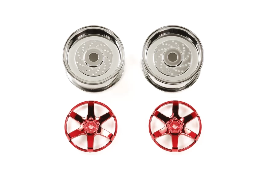 Jazz up your 1/10 scale touring car model with these new 2-piece wheels! They feature a stylish 6-spoke design, with the silver-color metal plated rims complemented by a red metal-plated cap and spokes.