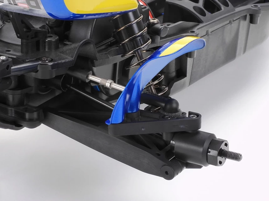 The TD4 is a shaft-driven 4WD buggy chassis which employs front inboard suspension for slim, low-profile form. It features a longitudinal battery pack position in the center and a midship transverse motor for optimum balance and improved performance. The drivetrain uses full bearings, and sealed front/rear gearboxes have built-in ball differentials. Two link rods and crank arm transmit movement of the left-side servo to the three-piece steering arm setup. 4-wheel independent double wishbone suspension utilizes CVA oil dampers. Turnbuckle shaft upper arms facilitate camber angle adjustment. Two types (high/low) of wing stays are included and star dish wheels are paired with square spike tires which offer superlative grip off-road.