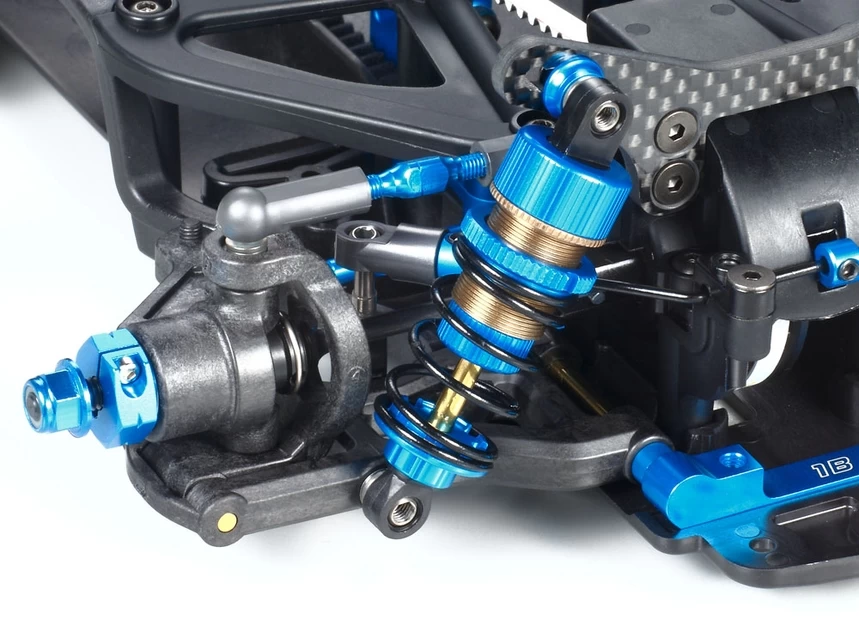 • The suspension has been fine tuned for a traction boost, employing medium rigidity suspension arms, carbon fiber reinforced uprights and hub carriers, TRF418 stabilizers, aluminum suspension mounts, TRF big bore dampers and carbon fiber damper stays.