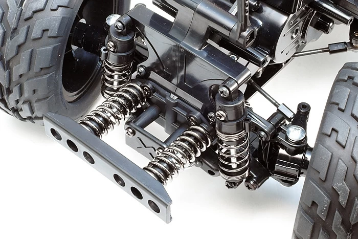 This gear-driven 4WD chassis is based around a lightweight and tough monocoque frame, with power provided by the centrally-positioned motor. It utilizes a ‘square’ setup with similar tread and wheelbase lengths. Sealed gearbox is integrated into the frame and protects from dust and debris, while the built-in front and rear differential gears provide smooth cornering. This is reinforced by 4-wheel double wishbone suspension and friction dampers plus a 2-piece tie rod steering setup with the servo on the left for excellent response. Furthermore, it has 5-spoke wheels fitted with big 110mm diameter tires, in addition to a rear support bar with roller to prevent the model from flipping.