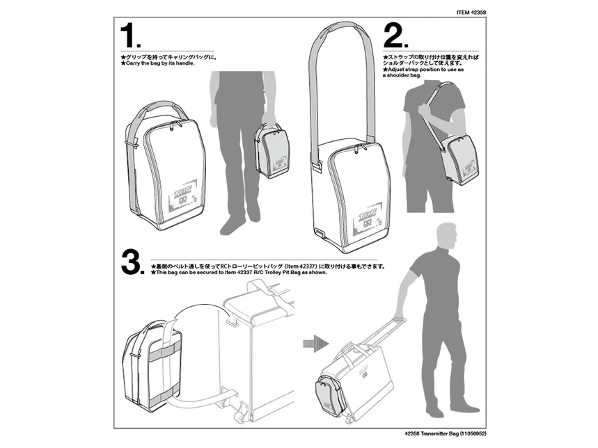 Radio Transmitters are not cheap, so you want to look after yours when you are on the move – enter this dedicated bag, which will carry it and other related items in safety! The bag can be carried in numerous ways and even attached to the separately sold TAMIYA trolley pit bag.